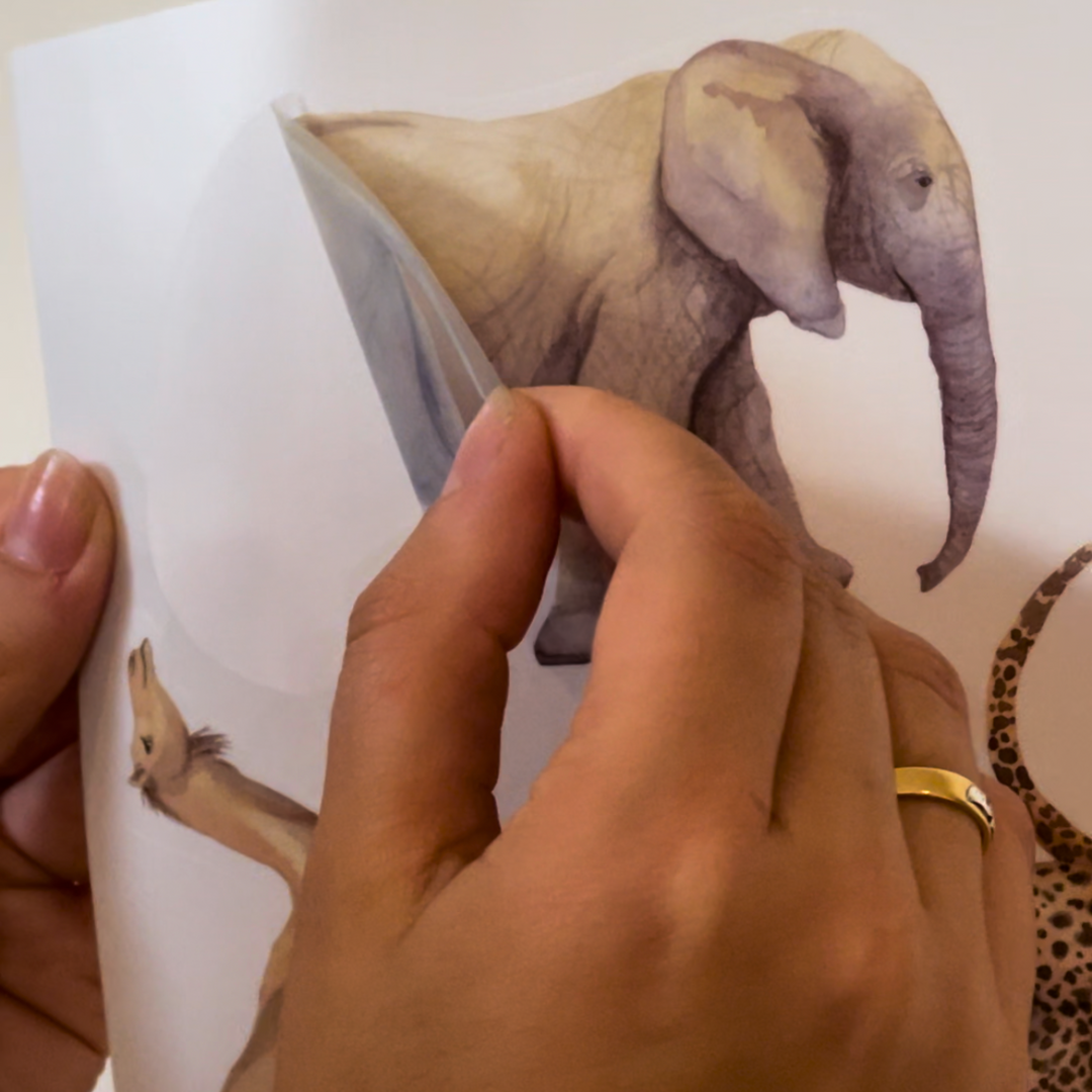 3) Peel your decals off the adhesive paper, taking care that the decal doesn’t fold and stick to itself, and position on your wall. Once all decals are correctly placed go over them and firmly, but gently, rub to adhere them properly to the wall to complete your masterpiece